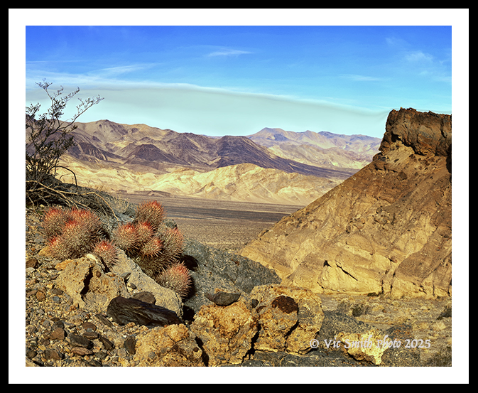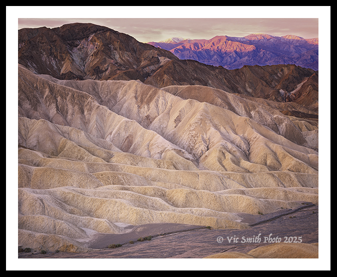 Directly down from the point was a jumble of colorful striped ridges, clays, silts, gravels, and volcanic ash deposited in a now vanished lake, then uptilted. At its left end was a tan tilted peak leaning to the south, Manly (remember this name) Beacon. To the right above was is a flat cap, like a sill, of flat dark volcanic earth, completely different from what’s below me. If I had climbed high enough on the canyon wall we could’ve seen, 40 miles away, a snow capped peak.